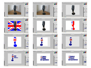 This was my final idea or what i thought was going to be it. I had another microphone with more detailing and that personally i thought looked nicer. It could also stand up nicely next to my text as it had a stand and was an upright microphone. I started my taking several images of it in what I believed to be a good position. I wanted the wire to be trailing away to leave it looking more electrical. When in Photoshop I drew around it with the pen tool and first of all deleted the background. Then i got a basic union jack flag from Google and placed it behind the microphone layer. I then created a new layer pressed Ctrl on the microphone and inverted selection and painted a white block all the way around the shape of my microphone on the empty layer. This was so once done i could still move the union jack around to get a good positioning.I then hid the actual microphone images and moved the union jack until it was in a position i was happy with once it was i merged the union jack and the white to create a single layer. I then changed the colours do a darker colour that I liked and turned the whole thing around so the wire part was running into where the text was going to be .I then got rid of the white again so i could position the logo exactly where i wanted it . The text i ended up using at first was coolvetica and was kind of happy with it but i hated the way the experience word stuck out really far therefore wanted to either shorten just that word replace it or do something different. After a while i decided to just go with BME which i did at first in the same font. After I realised the font didn't suit to be that big so i used a font called moderna and did it in all lower-case letters which looked much better. It then came to my attention that the block colours looked cheap and tacky which is why i decided to add a gradient and lighten the colours slightly. Just to finish off the logo i added the name underneath to finish it off. My mum then came in the room and when i asked her opinion she said "what's that shape though " so after asking a few more people and reev evaluating my options i decided to ditch the microphone idea altogether but i was really happy with the font which i intended to keep.